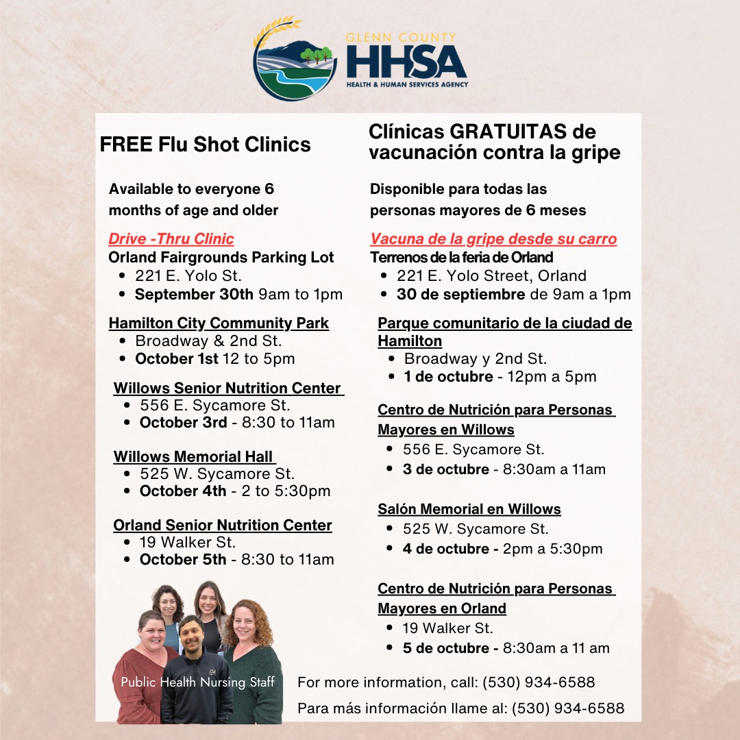 The 2023 Glenn County Public Health Flu Clinics are here! Flu vaccines are free and available to all community members six months of age and older. Check out our list of scheduled clinics to find the best day for you. Our first clinic will be a drive-thru on Saturday, September 30th, at the Orland Fairgrounds northside parking lot from 9 a.m. to 1 p.m. Our nursing staff is excited to assist you and give Glenn County community members a quick and convenient choice for their flu shots. We look forward to seeing you this year!